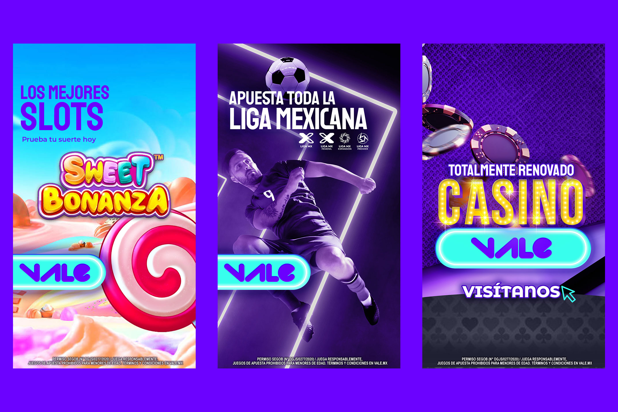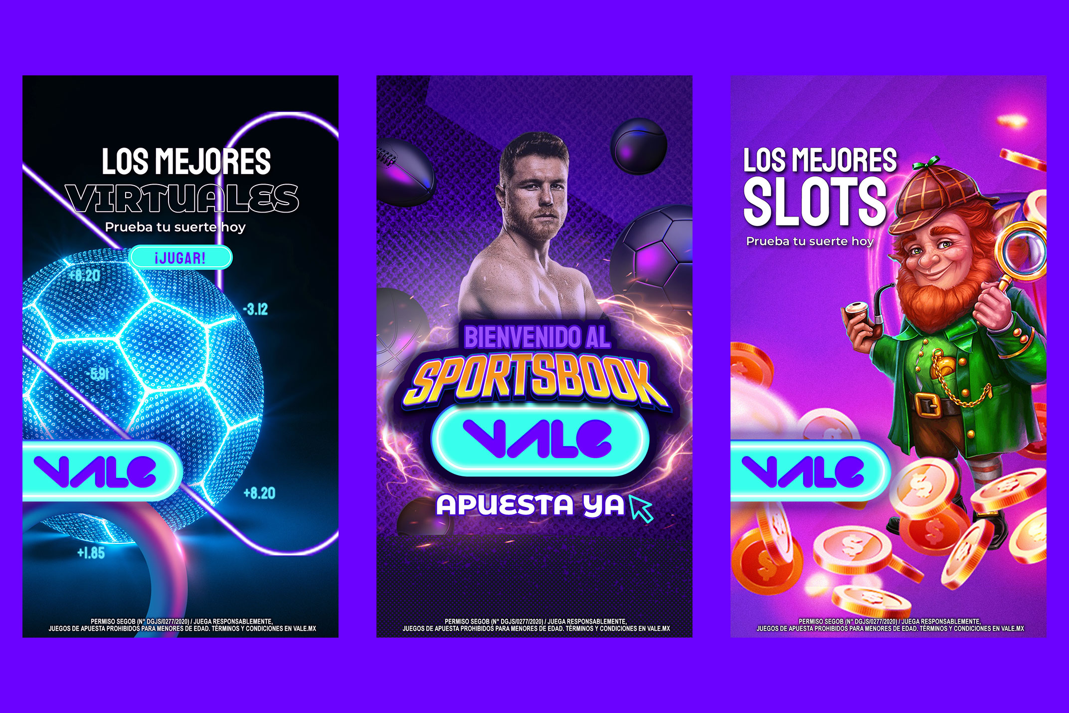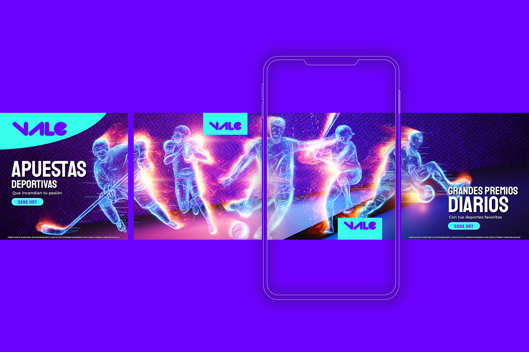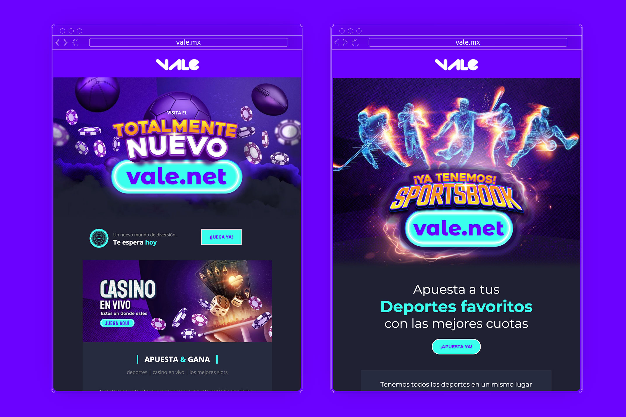 Creación del concepto y look & feel de lanzamiento de la marca. vale es una casa de apuestas online que ofrece jugar tanto en deportes en vivo como en slots. La idea fue estructurar los lineamientos clave de color comunicación visual para enganchar al consumidor. Se crearon aplicaciones digitales, landing pages, emailings y mucho más.