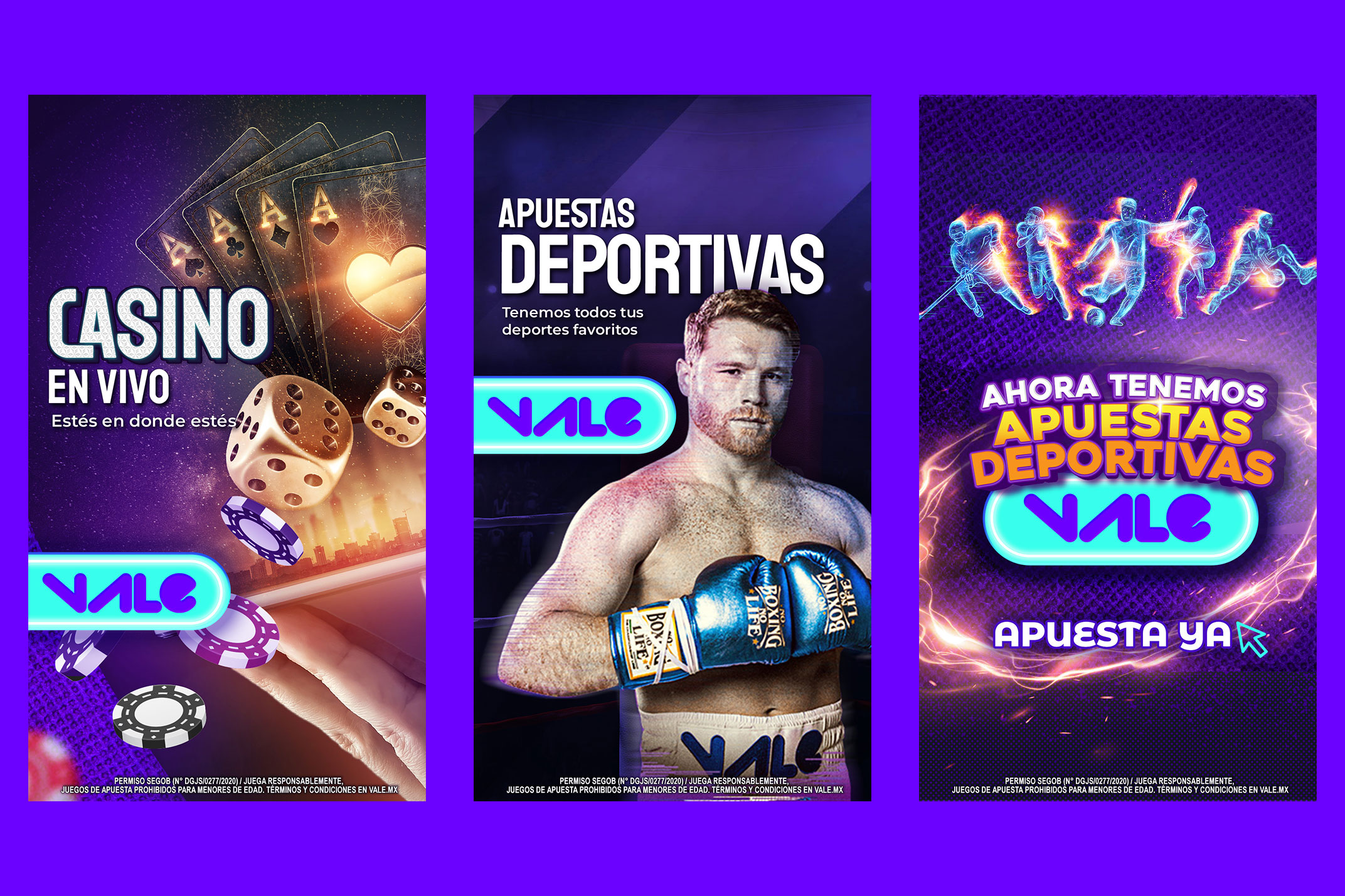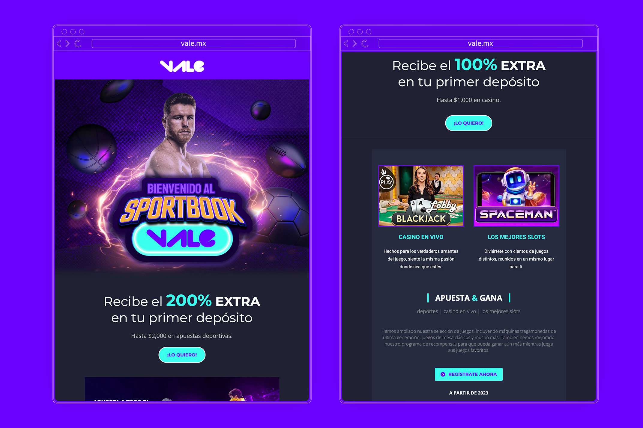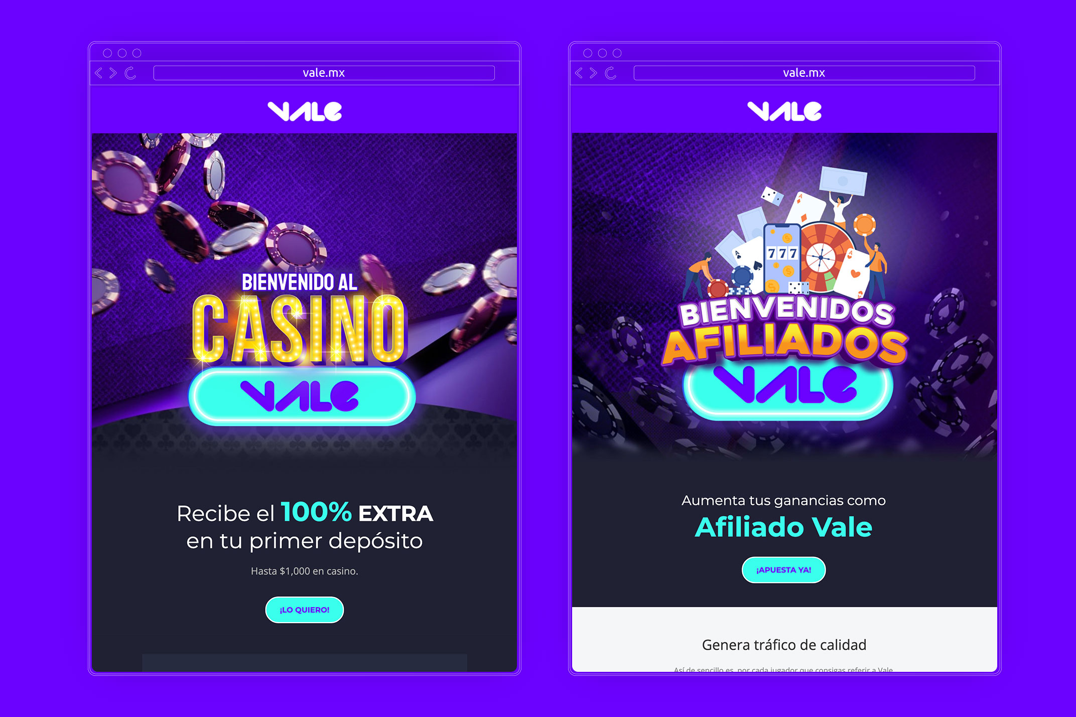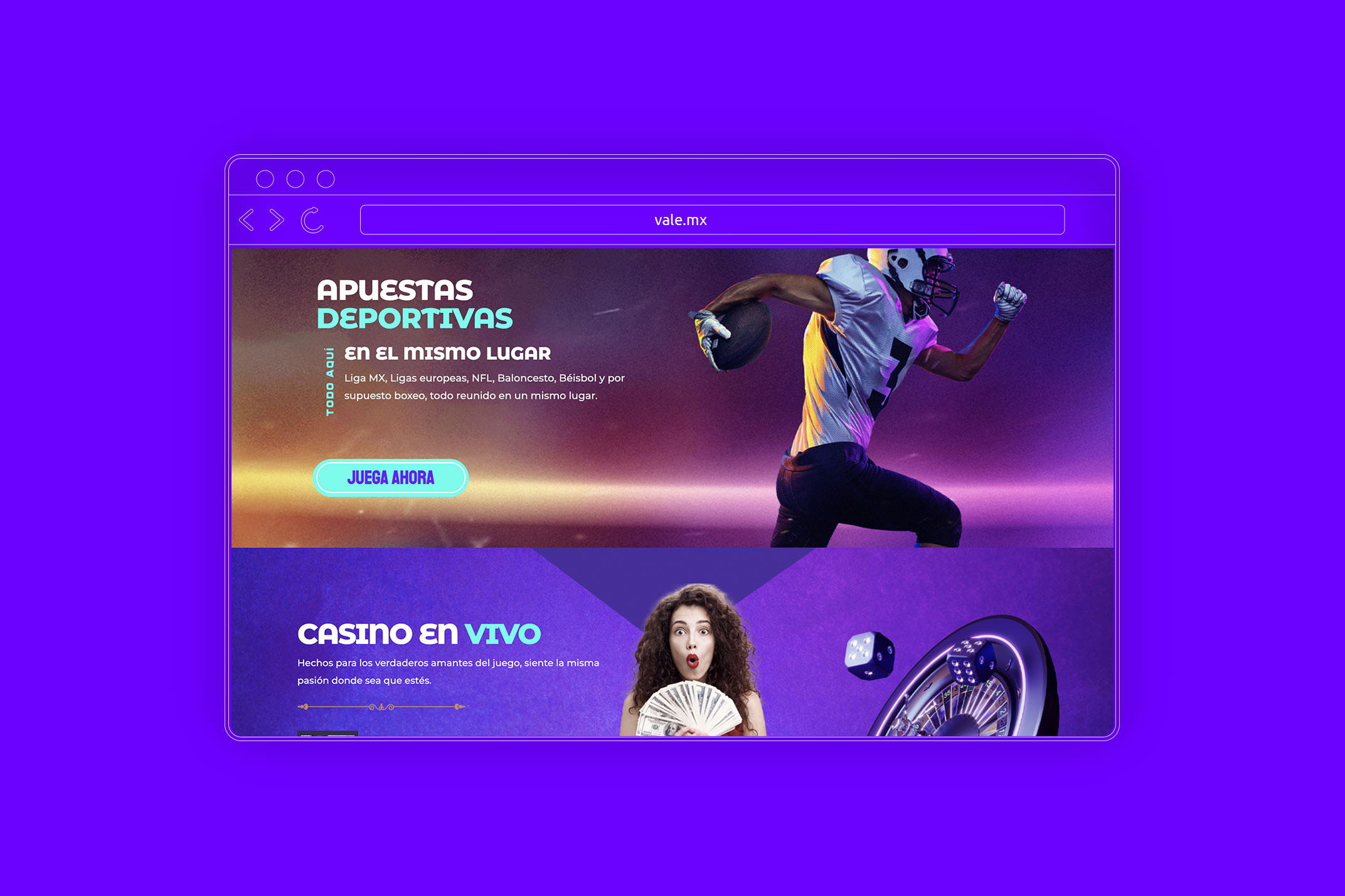 Creación del concepto y look & feel de lanzamiento de la marca. vale es una casa de apuestas online que ofrece jugar tanto en deportes en vivo como en slots. La idea fue estructurar los lineamientos clave de color comunicación visual para enganchar al consumidor. Se crearon aplicaciones digitales, landing pages, emailings y mucho más.