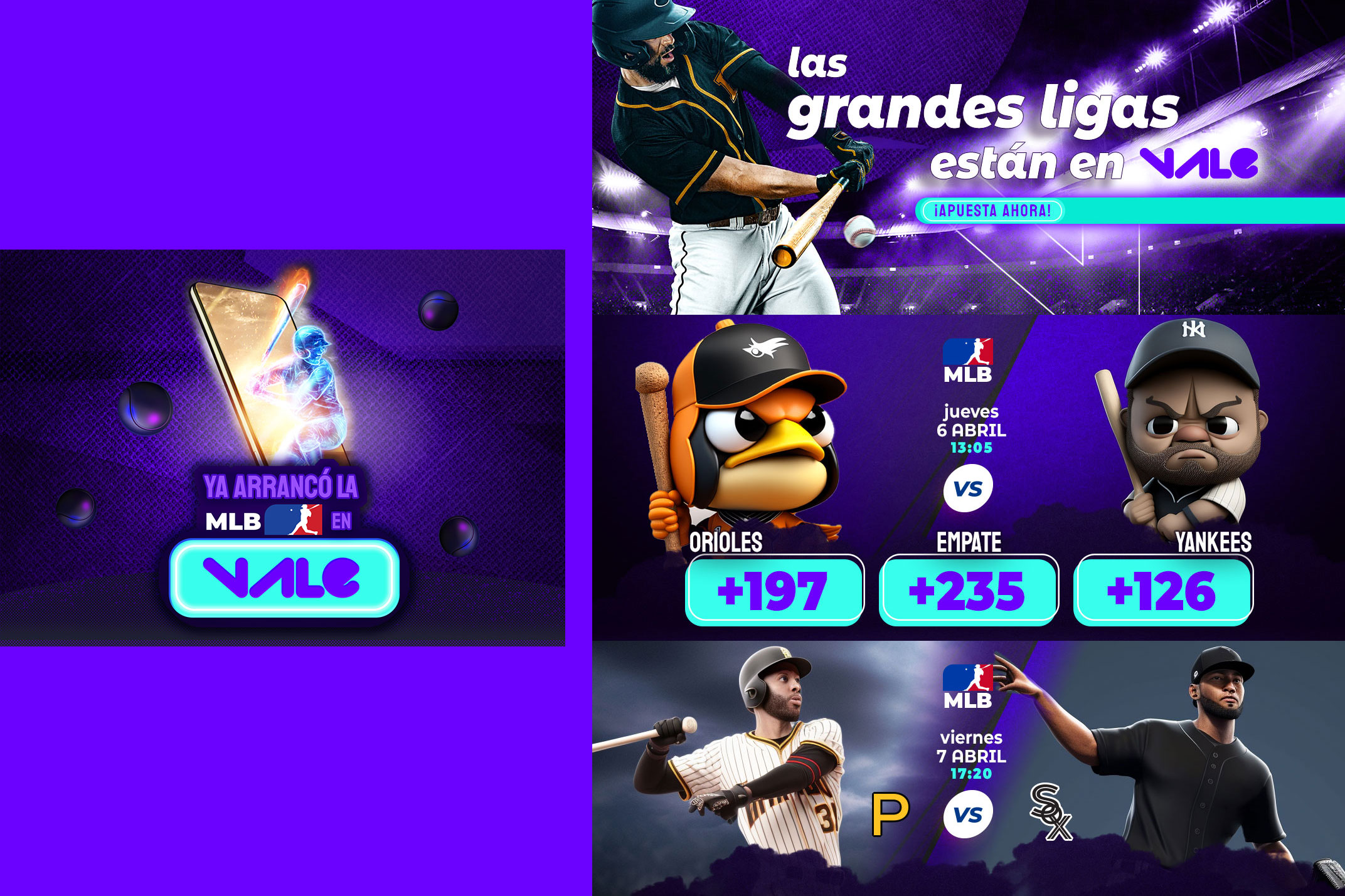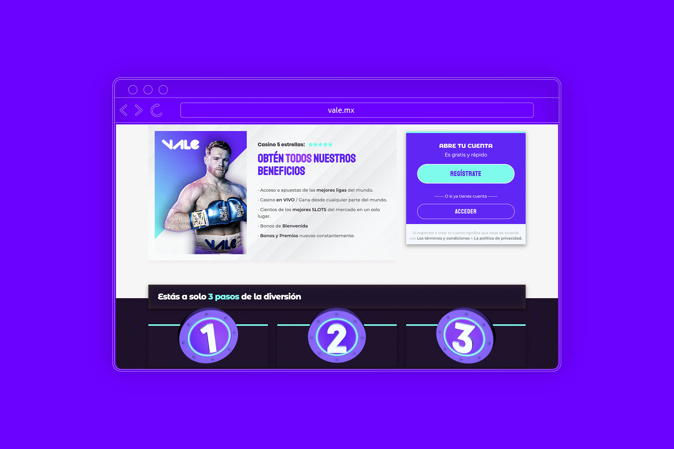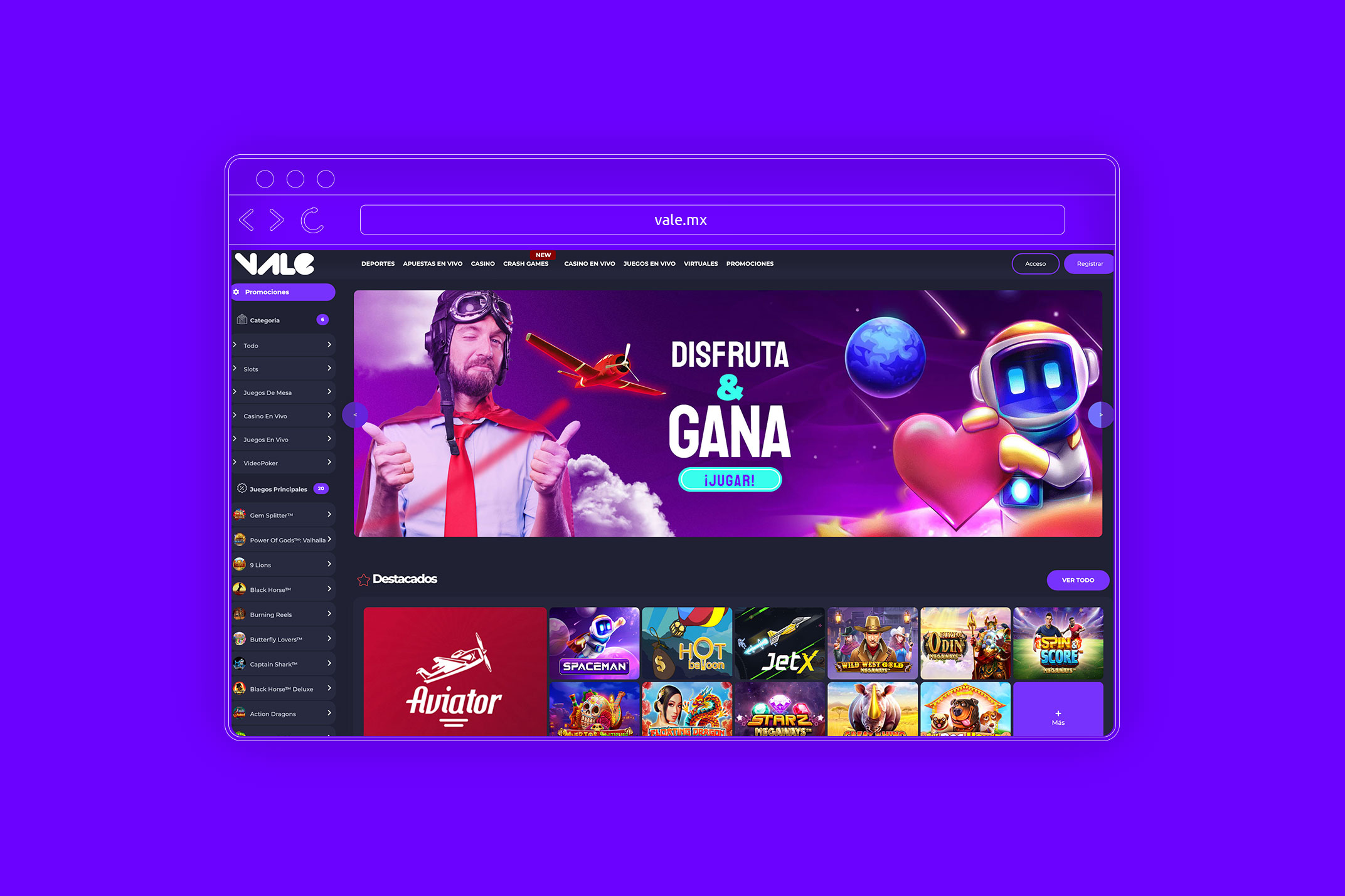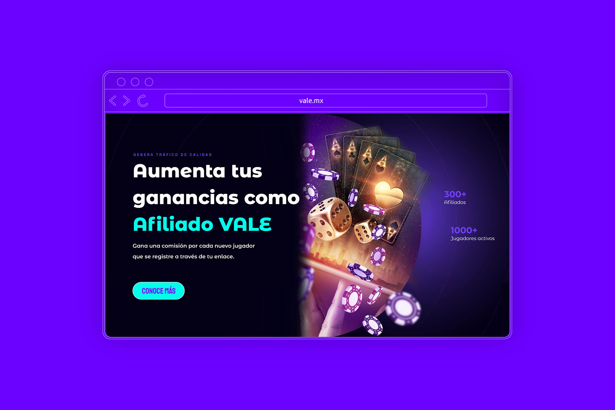 Creación del concepto y look & feel de lanzamiento de la marca. vale es una casa de apuestas online que ofrece jugar tanto en deportes en vivo como en slots. La idea fue estructurar los lineamientos clave de color comunicación visual para enganchar al consumidor. Se crearon aplicaciones digitales, landing pages, emailings y mucho más.